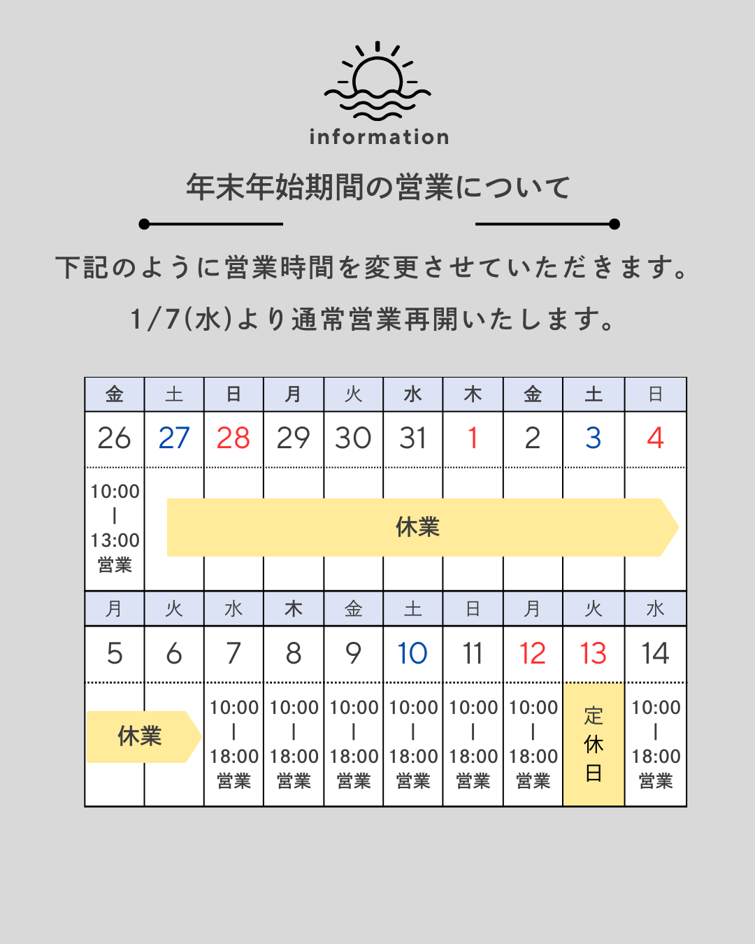 ▹休業期間:12月27日(土)〜 1月6日(火)