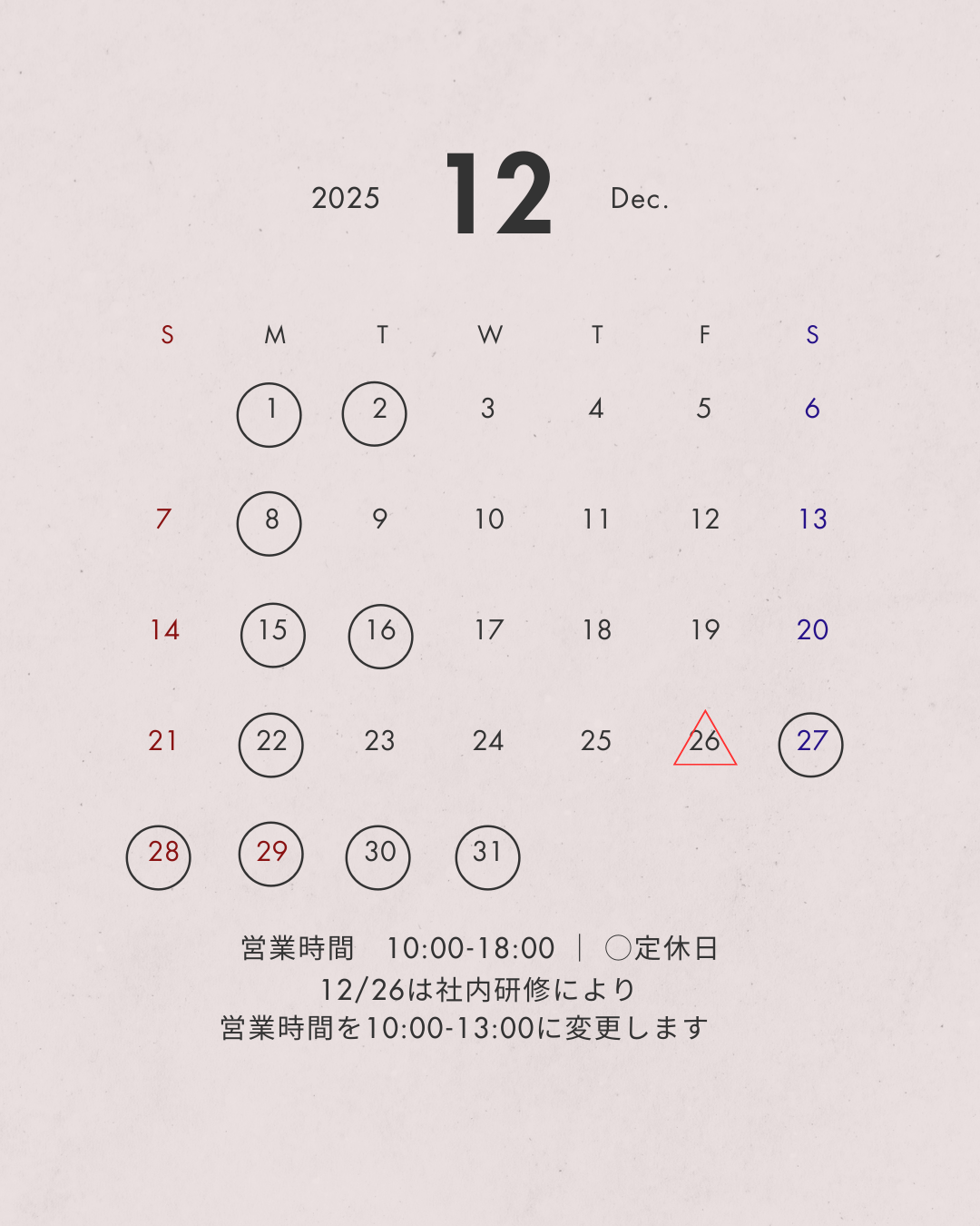 12月の定休日のお知らせです。