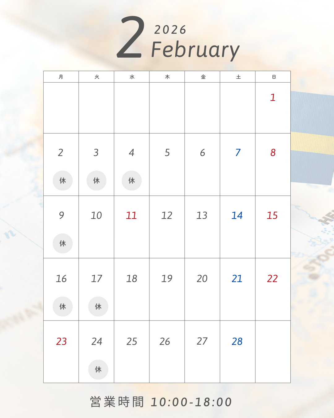 2026年2月の定休日は下記の通りとさせていただきます。